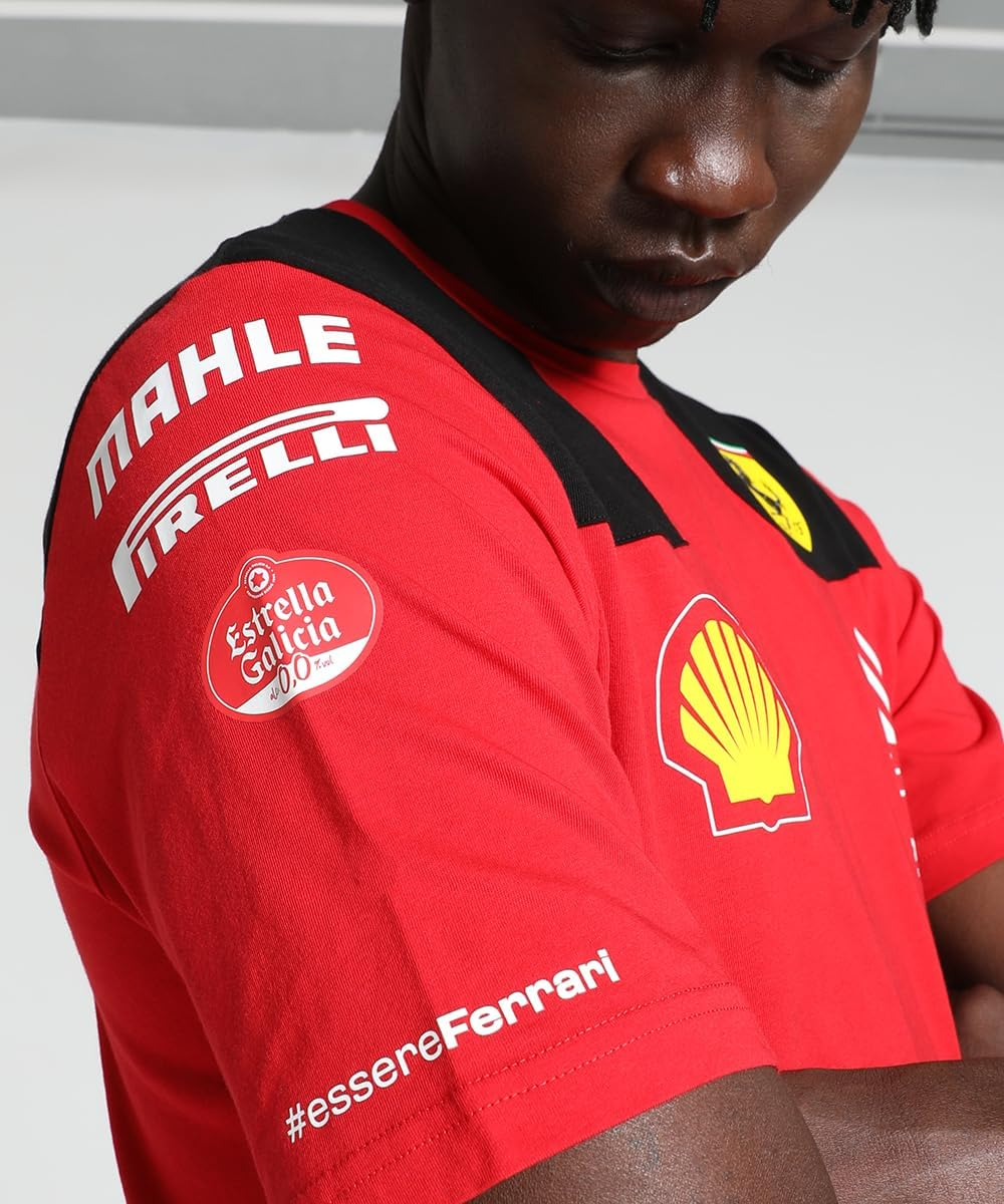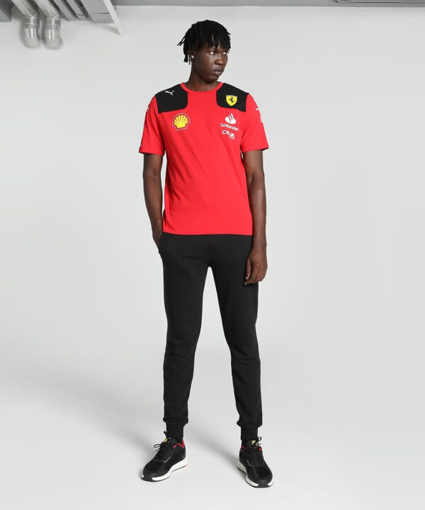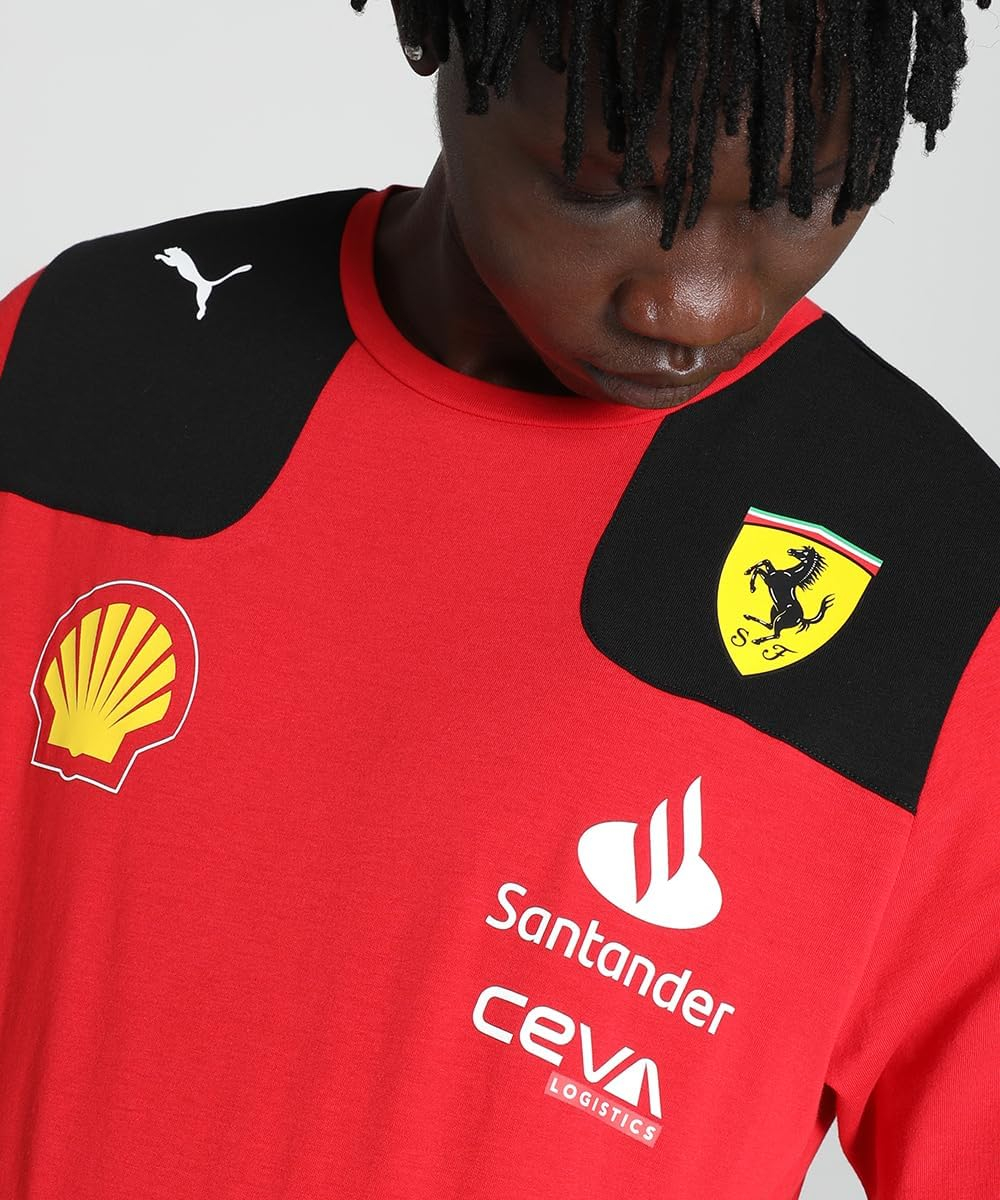 Carlos Sainz’s official PUMA Scuderia Ferrari F1 2023 Driver T-shirt, part of the PUMA Teamwear range as worn by Sainz during F1 race weekends. The Men’s Driver T-shirt features all the official Scuderia Ferrari team and sponsor logos from the 2023 F1 season, alongside Sainz’s 2023 driver number: 55.